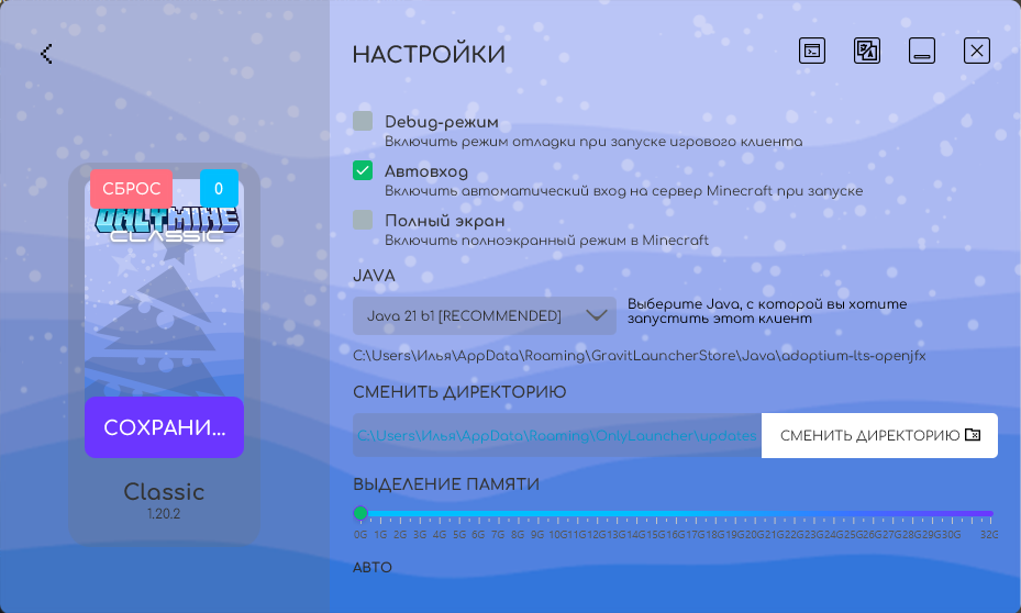 &#x20;\- Сменить директорию: (Рекомендуется не изменять этот параметр!) Изменяет стандартный путь установки Minecraft.